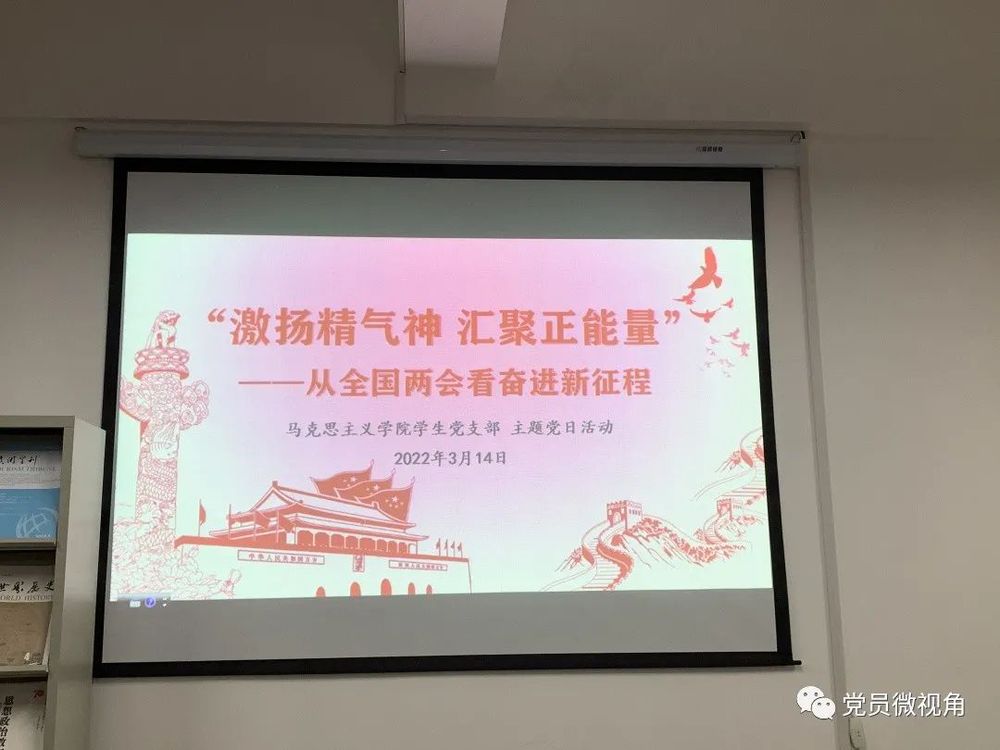 为加强学生党员素质建设,引领学生工作迈向新高度,马克思主义学院学生党支部于2022年3月14日开展以“激扬精气神,汇聚正能量”为主题的党日活动,解读2022年全国“两会”内容,活动由学生党支部书记郑晓锋主持。
