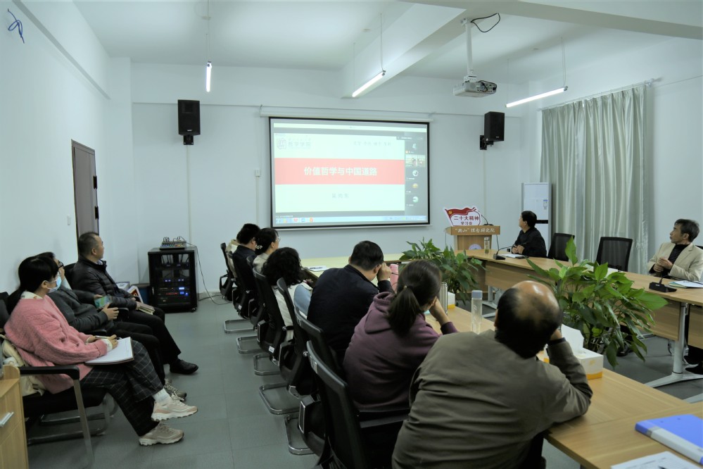 为深入学习贯彻党的二十大精神,2022年11月23日下午,马克思主义学院特邀教育部“长江学者”特聘教授、北京师范大学哲学院院长、教育部人文社科重点研究基地价值与文化研究中心主任、博士生导师吴向东教授为我院老师做了一场《价值哲学与中国道路》学术报告。报告由马克思主义学院院长吴凡明教授主持。