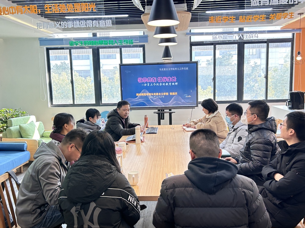 为进一步推进主题教育学习,大力选树宣传一批担当作为的先进典型,激励广大党员学习身边榜样和优秀事迹,积极营造崇尚先进、争先创优的浓厚氛围,12月27日下午,马克思主义学院精心组织了“学习身边榜样”活动,特邀20211411班班主任张建庆老师作育人工作经验分享。会议由学院党总支书记许金凤主持,各年级班主任、青年博士教师等参加。