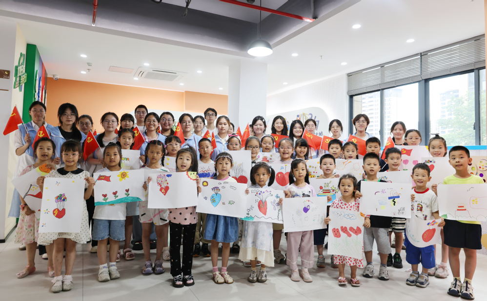 理论宣讲后,大学生实践队队员与社区青少年共同参与“红心绘党旗”现场活动。在洁白的画纸前,参与者以画笔勾勒红色印记,用色彩表达爱党情怀,将抽象的红色教育转化为可感可知的实践体验,实现了从“倾听者”到“创作者”的角色转变。