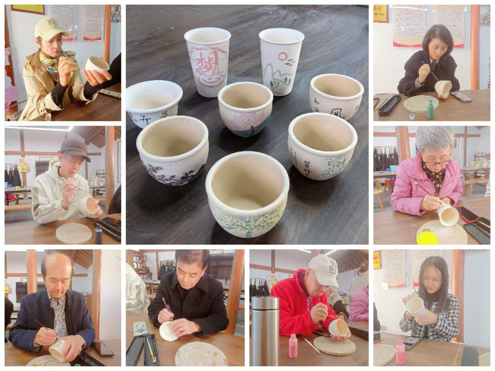 上午9点30分左右,老师们陆续抵达隐青·上河居民宿。这是一家集手工制作、品茶叙聊、文娱休闲为一体的民宿。民宿主理人向老师们介绍了陶艺的制作流程和文化寓意,随后老师们挑选了不同形状的陶坯,开始在各自的陶坯上绘制图案或者书写文字。清新典雅的翠竹园、金黄璀璨的银杏树、优雅冰洁的荷花、苍劲有力的书法,一幅幅生动的图景跃然陶坯之上。老师们在感受中华陶艺之美的同时,也添加了对晚年退休生活的注解和期盼。