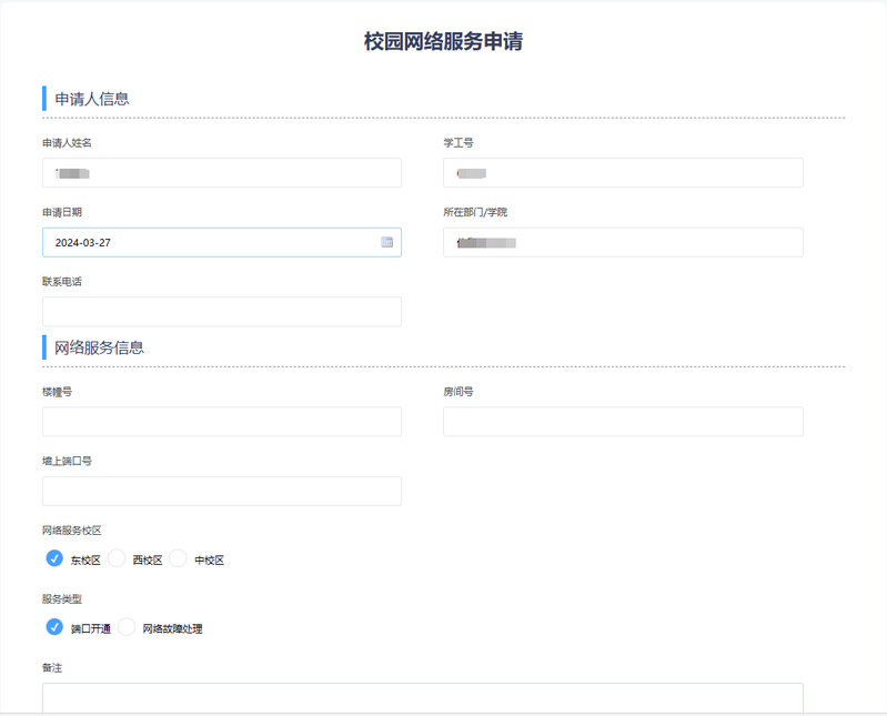 若学校部门办公地点无网络需要重新接入网络,可通过智慧校园——服务中心——校园网络服务申请来办理或点击链接进入服务中心进行校园网络服务申请: