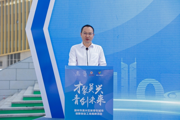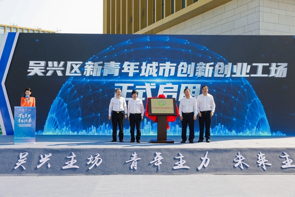 徐仲仪、金佩华、陈永华、赵如浪共同为吴兴区新青年创新创业工场揭牌。