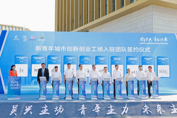 吴兴区人才产业集团党委书记、董事长杨勇和首批入驻团队代表进行了新青年城市创新创业工场入驻团队的签约仪式。