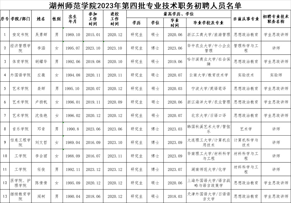 根据《浙江省人力资源和社会保障厅关于印发《浙江省职称评审管理实施办法》(试行)的通知》(浙人社发〔2020〕47号)、《优米app怎么下载软件专业技术职务评聘实施办法》(湖师院发〔2022〕54号)文件要求,经个人申报,所在单位推荐,学校审查,吴勇辉等13人符合专业技术职务初聘条件,现对初聘对象有关情况予以公示:
