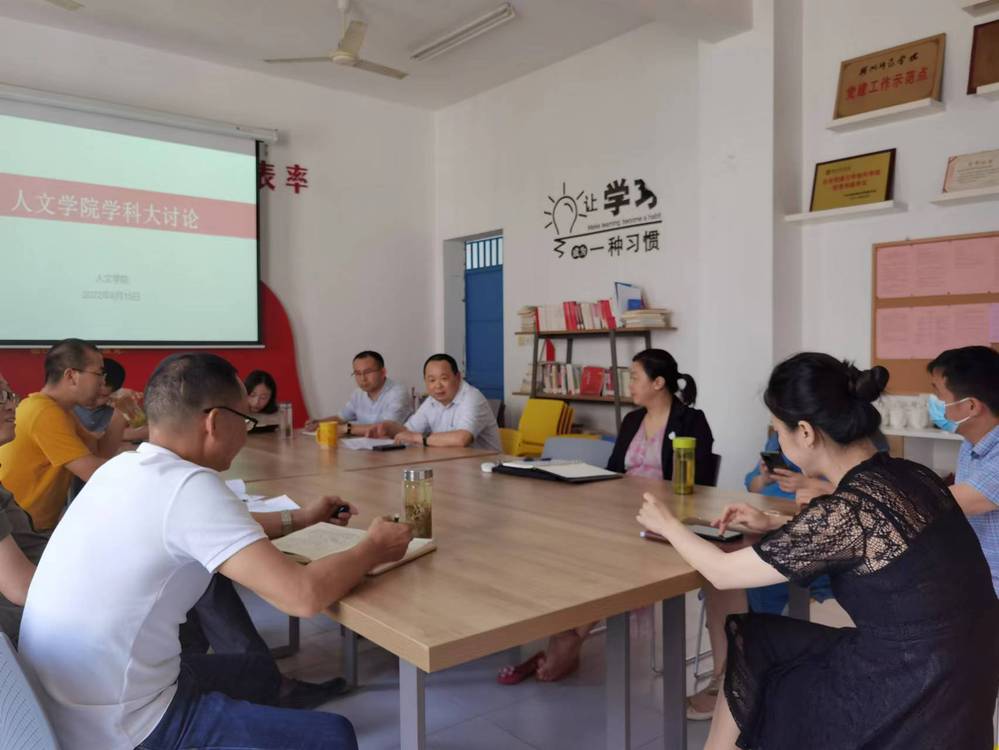 6月15日下午,按照学校学科大讨论文件精神,人文学院组织召开大讨论第二阶段即学院层面的讨论会议,会议由王绍峰院长主持,学院领导班子成员及人文学院各学科专业带头人、学科方向负责人参加,会议深入分析本学院各一级学科在国内的地位,会议重点解剖了汉语国际教育专硕、历史学学硕申报典型材料,并就人文学院学科发展总体规划进行了研讨,会议深入分析了中国语言文学、历史学、新闻学学科学科队伍建设、硬件建设等存在的问题和差距,梳理了影响制约学科快速发展的体制机制原因,并就加强科研教研成果培育、学科平台的建设等方面内容展开了深入分析和热烈讨论。会议同时也对学校学科建设与管理积极建议。会议达到了理清思路、激发热情、凝聚共识的良好效果。