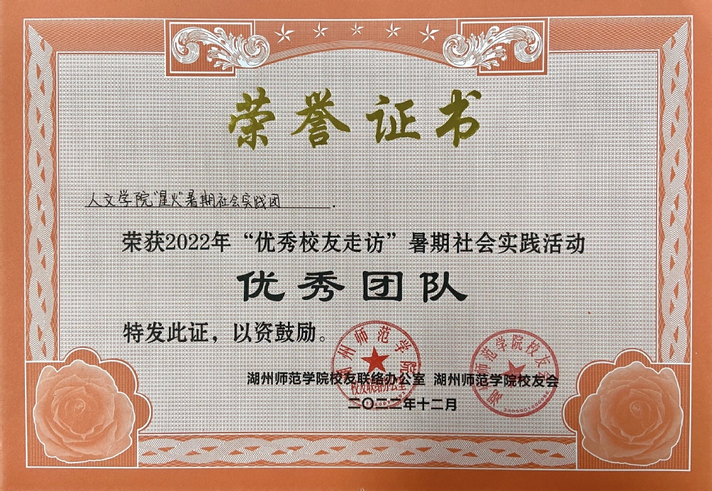 人文学院“星火”优秀校友走访实践团由汉语言文学(师范)专业和历史学(师范)专业的22名学生组成。实践团队分别走访了杭州、湖州、金华、宁波和温州的优秀青年校友,在成员的共同努力下团队荣获2022年“优秀校友走访”暑期社会实践活动优秀团队。