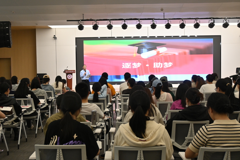 大会以线下专场和线上直播相结合的方式进行。首先,学院党委书记蔡振春为学院2023届考研上岸学生颁发“逐梦之星”奖杯,希望他们继续用奋斗抒写自己的青春华章。2023届“逐梦之星”代表用自己的考研心路历程、体会经验,鼓励学弟学妹们坚定考研决心和信心。2024届考研学生代表表达了立志逐梦的信念和勇气。