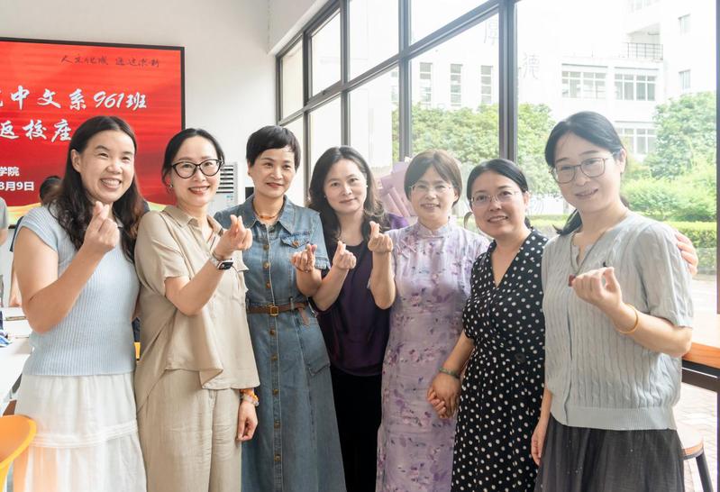 盛夏未央,情谊绵长。8月9日,人文学院中文系961班校友怀着对母校的深切眷恋,重返阔别25年的校园,共同开启“青春再回首”毕业周年纪念活动。校友工作办公室主任谢杭,人文学院院长潘明福、党委书记程龙、党委副书记谭珊,师生代表及原中文系党总支书记许莉萍,时任班主任杜隽、赵红娟、苏向红等恩师出席活动,与校友们共叙师生情谊,同忆峥嵘岁月。