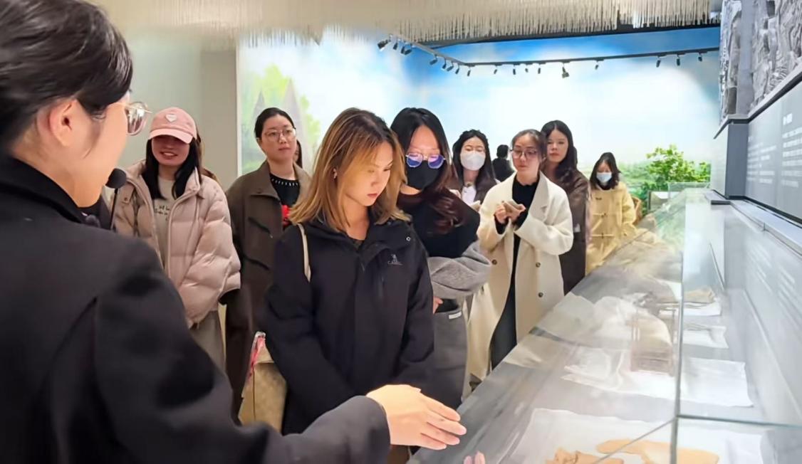 研学伊始,师生一行率先参观了文化交流中心一楼展区。在讲解员的细致引导下,大家循着遗址考古发现的时间线,系统了解了钱山漾丝绸文化的历史沿革、考古实证与非遗保护实践成果。当驻足于遗址模拟考古坑旁,得知此处出土的绢片将中国丝绸文明追溯至4700多年前时,同学们无不感慨先民的智慧与创造力,更对湖州作为“世界丝绸之源”的文化地位产生了直观认知。