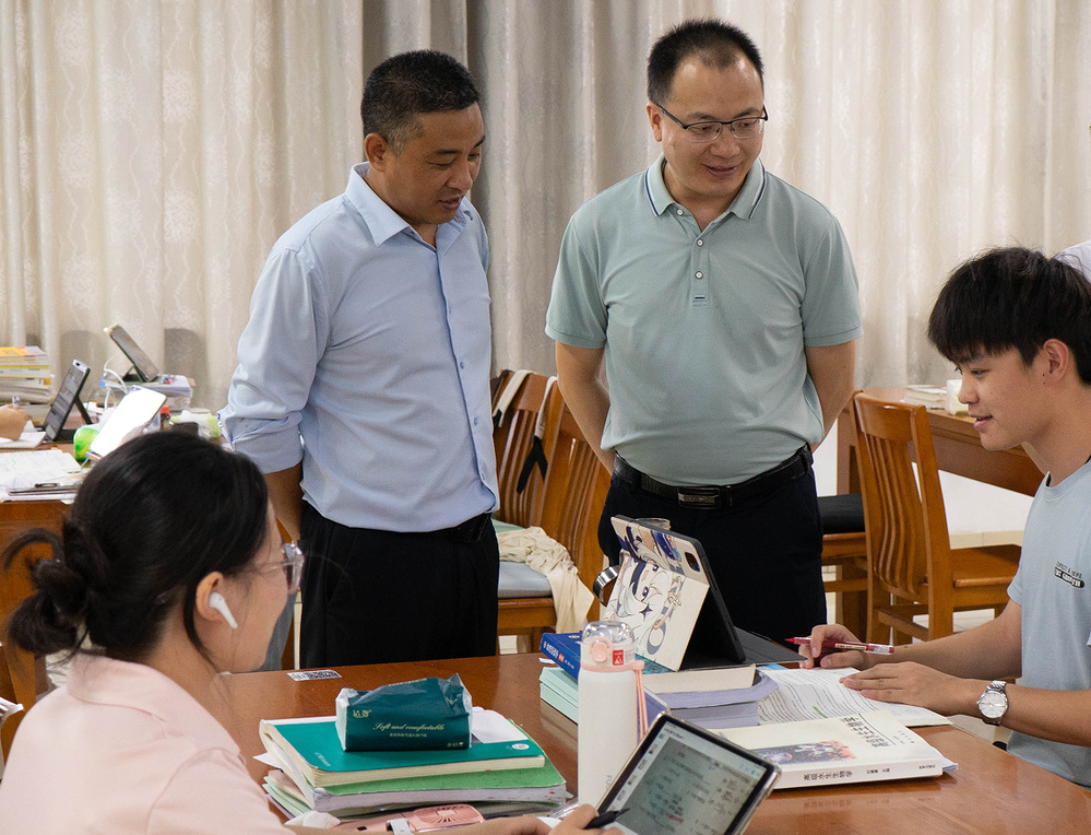 在考研自习室走访慰问中,学院院长王桦肯定了同学们选择考研的正确性,并结合自身考研经历,鼓励同学们在暑期备考期间调整好心态,把考研当作一次充实珍贵的经历,勇毅前行、坚持到底;学院党委书记蔡振春对同学们不畏酷暑、坚持学习的毅力和决心表示肯定,关切询问近期食宿情况和学习计划,耐心倾听大家学习进度的同时给予指导性的建议;学院副院长吴成龙为考研学子加油打气,希望同学们能利用好暑期的“黄金充电时间”,落实好各项考研复习任务,全力学习备考,为将来科研深造做准备;学院党委副书记曹羌琴叮嘱同学们在暑期留校备考阶段一定要注意饮食规律,保持身体健康。