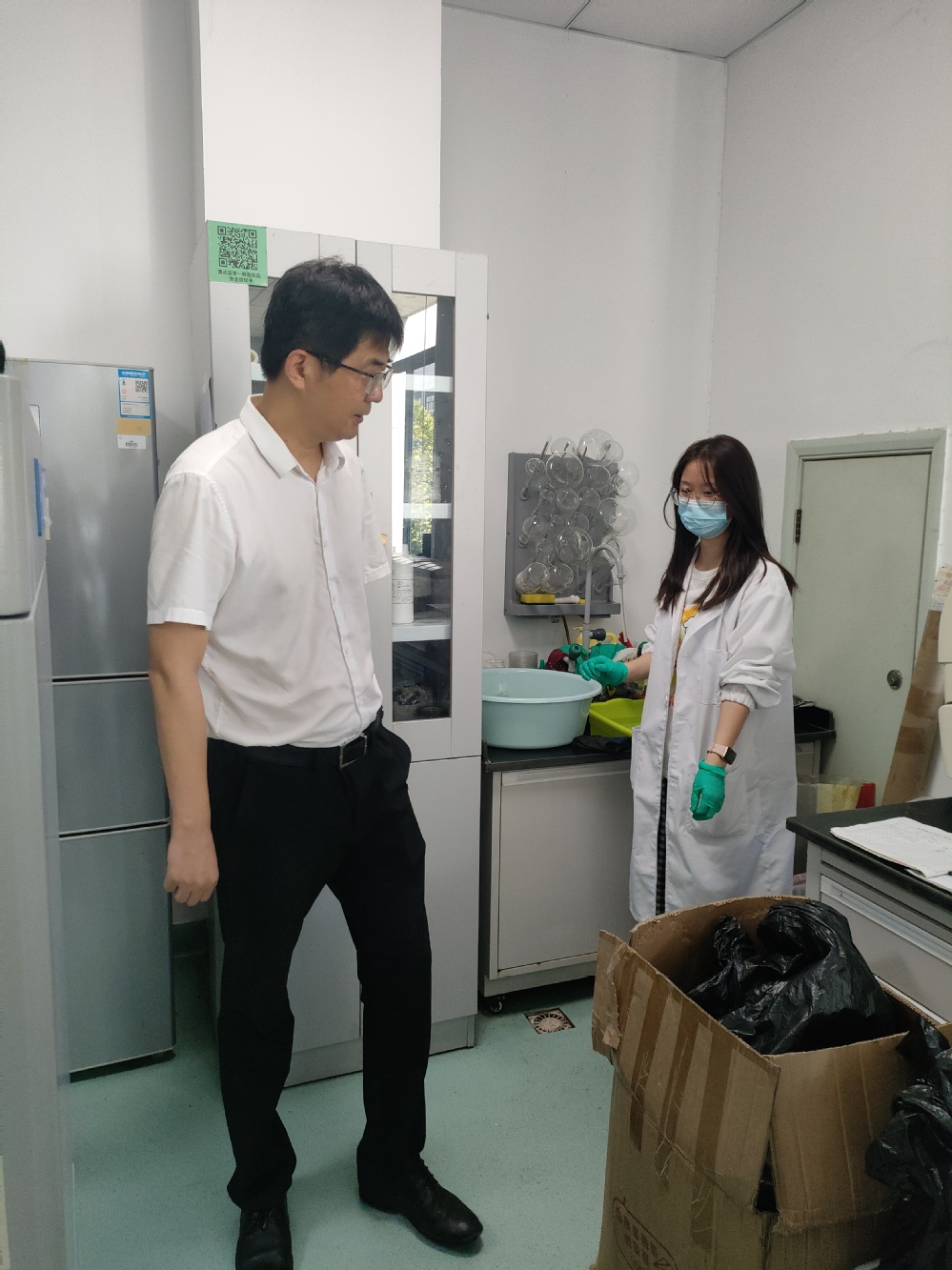 检查组一行对实验室的用电安全、高温加热设备运行状态和巡查记录、危化品管理和使用台账、消防设施、应急处置方案等关键环节进行了仔细排查,并与实验室师生亲切交流,详细询问暑期实验室开放、人员值班安排以及安全保障措施落实情况。
