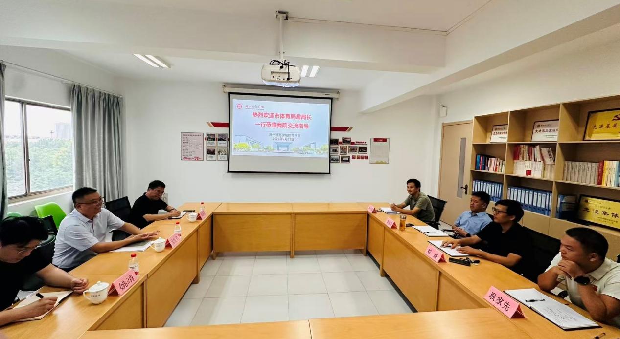 9月23日下午,市体育局副局长居世宾、市体校副校长崔国强、体育产业与竞赛指导中心副主任姚靖来学院交流。学院党委书记章东飞、执行院长刘炼、副院长耿家先及教师代表参加会议。