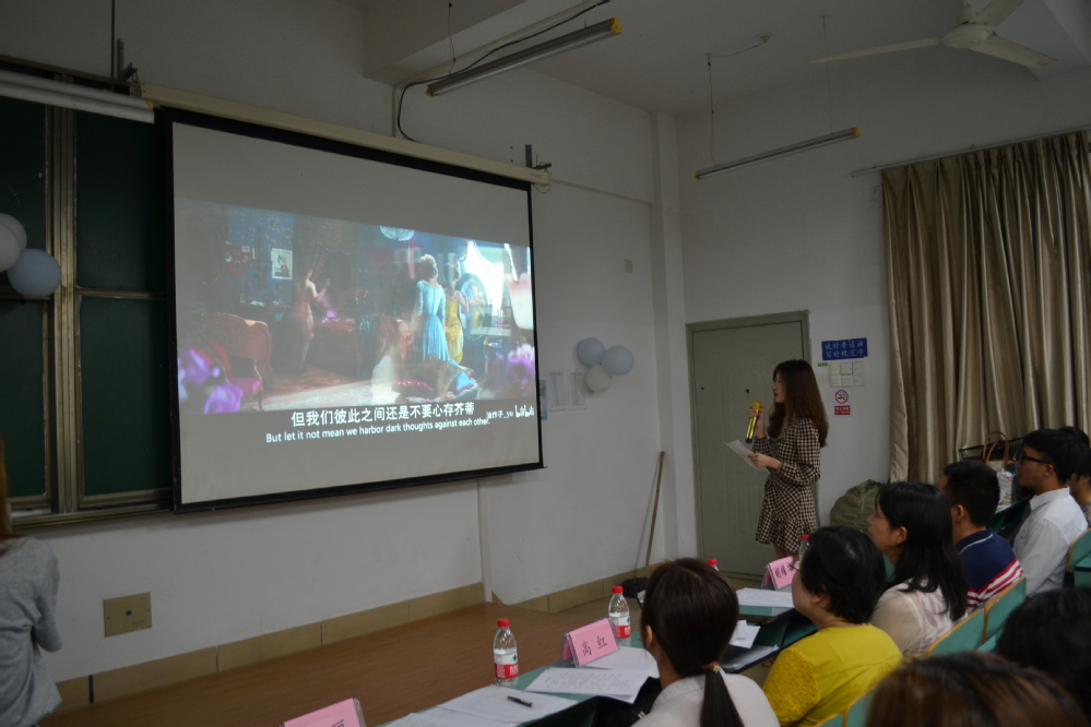 参赛选手自备一份外文影视剧消声片段,并进行现场配音。经过精心的准备后,选手们组织台词并加入自己的创意创新,给予大家全新视听享受。其中不乏幽默搞笑的动漫配音、煽情的影视片段,选手们将自己的想象力和创造力发挥得淋漓尽致,配音模仿惟妙惟肖。她们抑扬顿挫的语调,时而激昂高亢,时而深情低沉,赢得观众阵阵掌。比赛在大家的意犹未尽中落下帷幕。评委老师们根据各组选手的语音语调,团队合作,艺术效果和思维创新等方面进行打分,同时用英、日、德三种语言给出了精彩的点评。