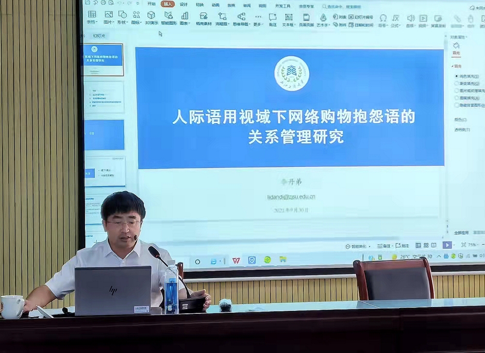 9月30日(周三)下午, 浙江工商大学外国语学院院长李丹弟教授应邀来我院给师生做了一场题为《人际语用视域下网络购物抱怨语的关系管理研究》的讲座。讲座由院长初良龙主持,英、日、俄、大学外语的教师聆听了讲座。