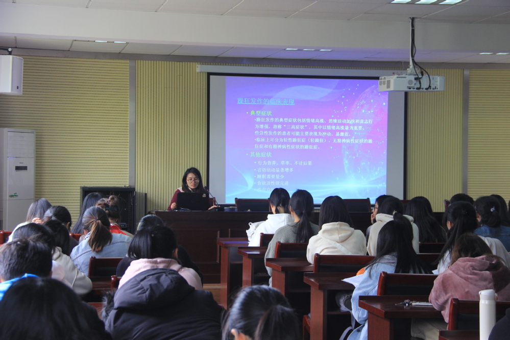 为了让大家更好的了解严重心理问题的表现,李老师从精神障碍主要病症、严重心理问题概念以及个体患病时的症状表现三大方面进行了详细讲解并着重阐述了抑郁症产生的原因及其临床表现。李老师还补充了抑郁症的治疗方法除了药物治疗、心理咨询与治疗等方法,还可以通过正规渠道了解抑郁症相关知识,向值得信任的人敞开心扉以及规律的锻炼等方法来对抗抑郁。李老师重点强调,如果身边的同学患了抑郁症,最重要的就是给同学提供理解、关怀和陪伴。接着李老师还从定义、会产生的表现、轻度与重度的区别、产生的原因、治疗的方法等方面介绍了什么是双相情感障碍。并提出双相情感障碍是一种疾病,不是个人的错误,可以通过规范的治疗,恢复精彩的人生。李老师的讲解让同学们清楚地了解到各种严重心理问题,懂得了更多解决心理问题的方法。