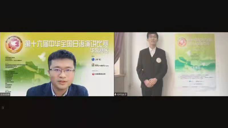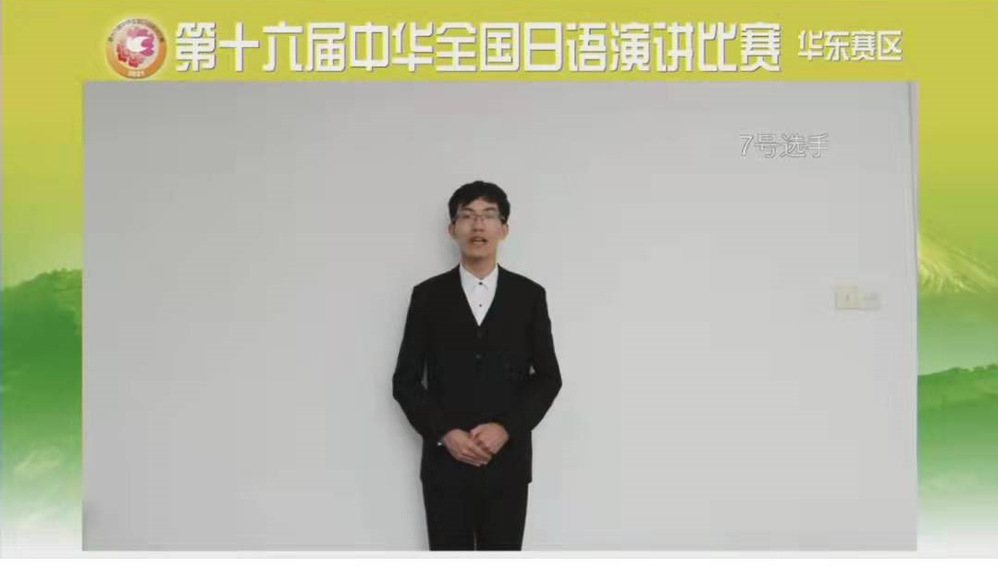 我校于2021年9月组织校内选拔赛,共有19名学生(其中包括3名非日语专业学生)报名参赛,最终贾凯霖脱颖而出,获得一等奖,代表我校参加此次华东赛区比赛。本次比赛采取线上线下相结合的方式进行,分命题演讲和即兴演讲两个部分。命题演讲由选手事先录制视频提交大赛组委会统一评审,即兴演讲要求选手线上选择题目序号进行演讲。即兴演讲部分对选手的随机应变能力、逻辑思维能力和语言组织能力要求很高,具有极大挑战性。
