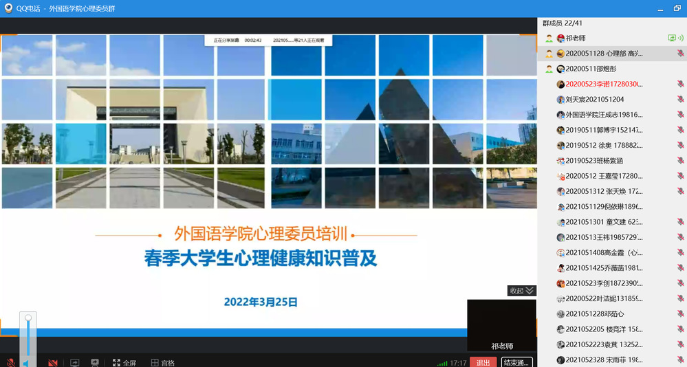 为提高学院心理健康教育工作水平,建设一支具备心理自助与助人能力的心理工作队伍,充分发挥班级心理委员的作用,提高心理委员整体心理素质。3月25日,我院以线上的形式举办了本学期第一期心理委员培训,学工办主任祁琼老师主讲。