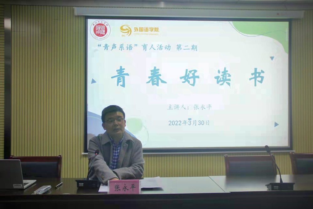 3月30日晚,我院举办第二期“青声系语”育人活动。副院长张永平老师以“青春好读书”为主题和大一日语学生分享读书心得,激励同学们不负韶华,在最美的年纪读最适合的书。