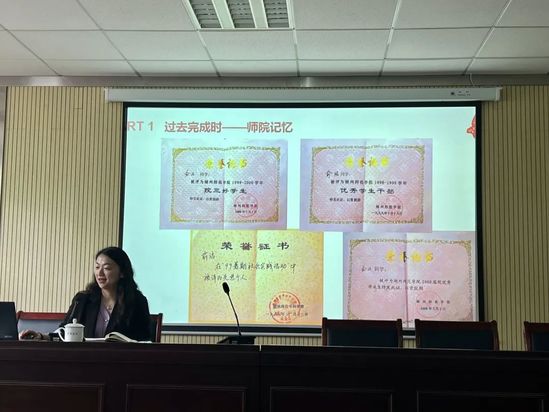 俞洁老师介绍了她和湖师院的共同记忆。作为师院的第一届毕业生,她对自己的大学回忆充满了感慨。大学四年里,她勤恳学习,是图书馆的常客。俞洁老师还向外小鱼们展示了大学时使用的笔记本,其中的笔记至今都让她受益颇多。她的踏实奋进是她获得荣誉的源头,也是成就她任教生涯的关键因素。