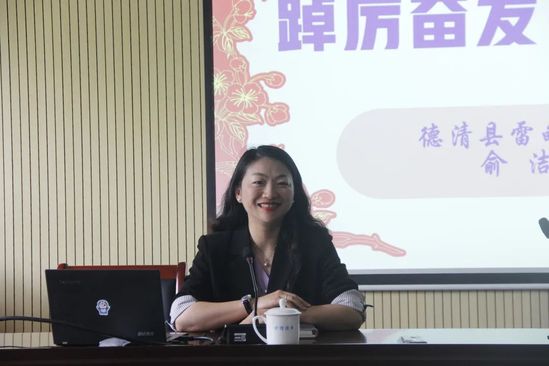 接着,俞洁老师讲述了她在德清县第二中学的任教生涯。在二十年的时间里,俞洁老师立足本职,面向世界,多次向如日本、美国等国家的学生展示中国的文化特色和教学特色;在教学方面,她的有关“作业减负”的文章被人民日报转载,与如今的“双减”政策不谋而合;在国际舞台上,俞洁老师曾以双语志愿者的身份,为联合国地理信息大会贡献自己的力量;业余生活中,俞洁老师也热爱生活,乐于探索,参加了太极拳和插花比赛,丰富了自己的精彩人生。
