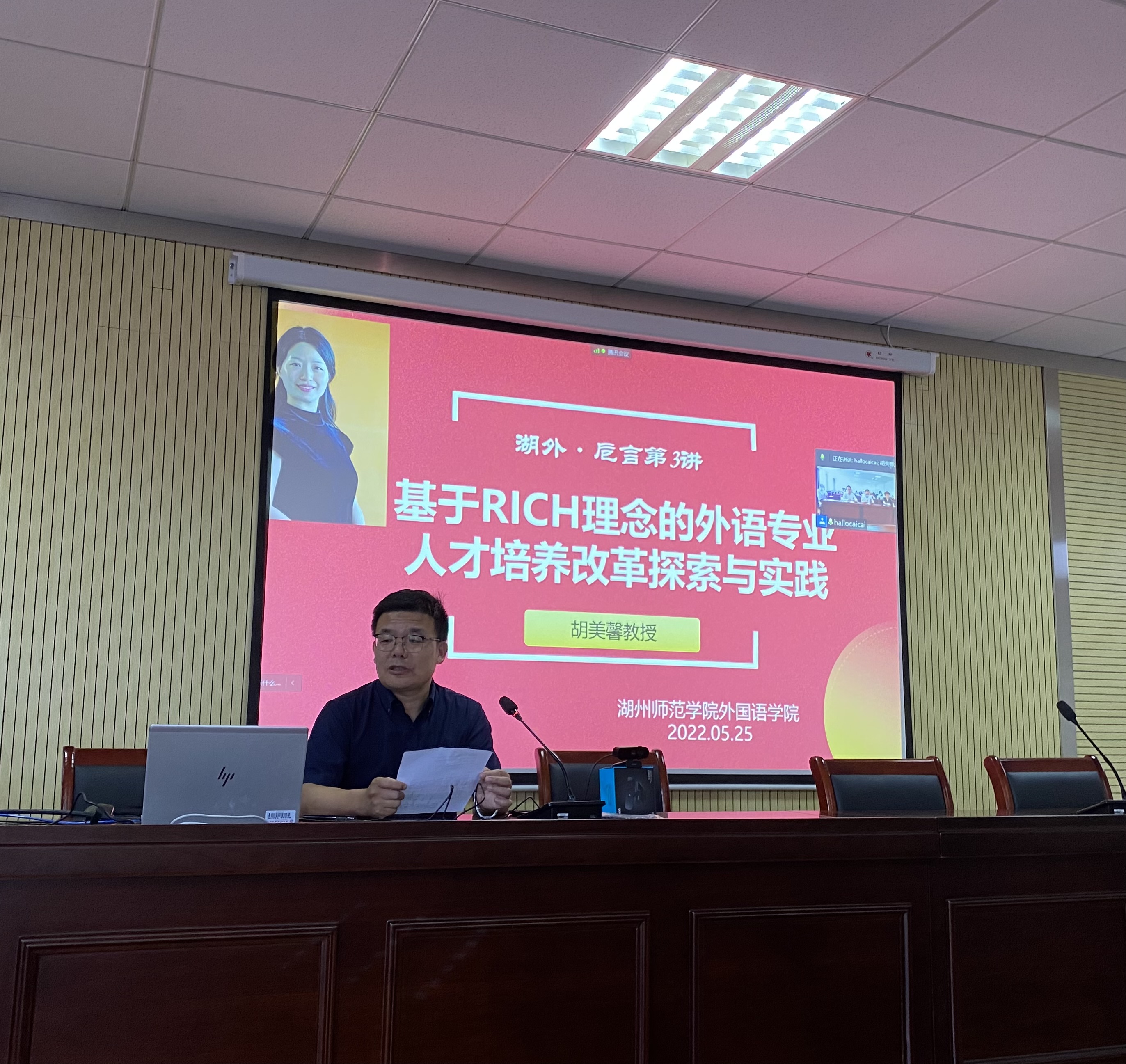 5月25日下午,浙江师范大学外国语学院院长胡美馨教授应邀在腾讯会议作了一场题为“基于RICH理念的外语专业优米app官方下载入口手机版改革探索与实践”的讲座。我院副院长张永平老师主持,全体英语系教师参加了本次讲座。