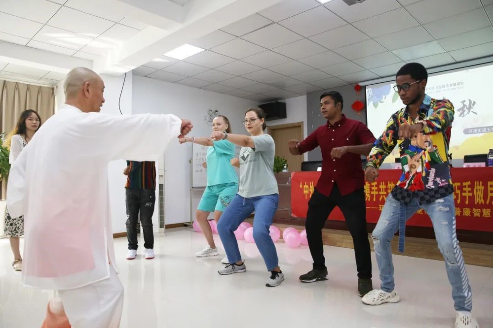 活动中,社区居民表演了舞蹈、黄梅戏、太极拳等中国传统文化。在学院党员志愿者的翻译助理下,留学生同学了解了传统中秋风俗。学生党员志愿者和留学生在武术老师的教授下,学习了中国武术,并和社区居民一起动手制作中秋传统美食月饼。在感受节日氛围的同时,同学们也共同体会中华传统文化的独特魅力。