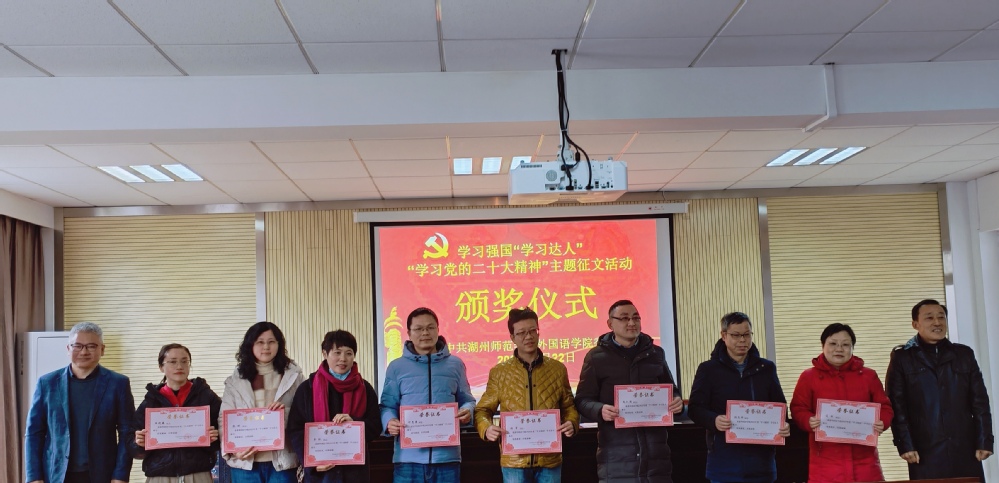 2月22日下午,外国语学院召开新学期第一次全体党员大会并隆重举行2022年度“学习强国”学习达人评选活动及“学习党的二十大精神”主题征文活动颁奖仪式。共有16名党员教师和5名学生党员获奖。外国语学院党委书记韩祥临、外国语学院院长、党委副书记初良龙为获奖的党员颁奖。