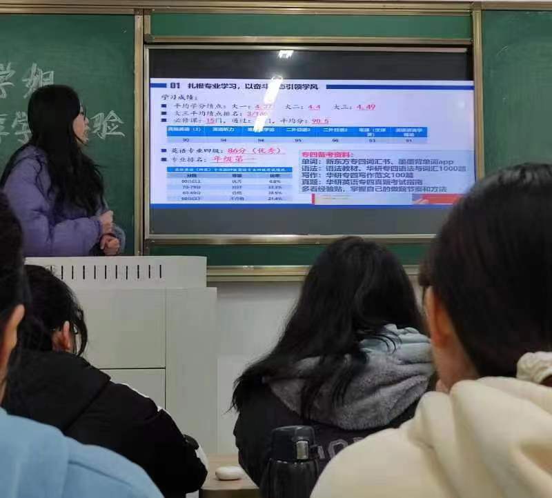 活动伊始,乔欢同学首先向大家分享了自己对于英语学习的四个观点和自己的刻苦学习态度。她琳琅满目的奖状无一不证实着她学习方法的成功,并鼓励着同学们积极地克服学习道路上的困难。她接下来又毫不吝啬地向同学们展示了自己的学习资源,其中不乏一些专四专八的学习资料,她同时殷切地劝勉同学们从大一开始备考专四,为未来更流畅地学习铺好道路。乔欢以她四年如一日的勤奋学习经历,告诉同学们,纵然天资不那么超群,依然可以用努力来实现自己的梦想,甚至是赶超那些天才。