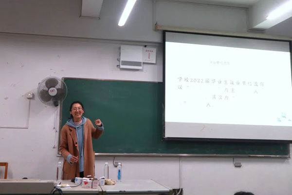 首先,徐老师对2022届毕业生就业质量年度报告进行了讲解,向同学们展示了大致的就业方向。她表示当前的就业大环境有政策好、机会多、体制内等特点,同学们要抓紧机会,努力上岸。