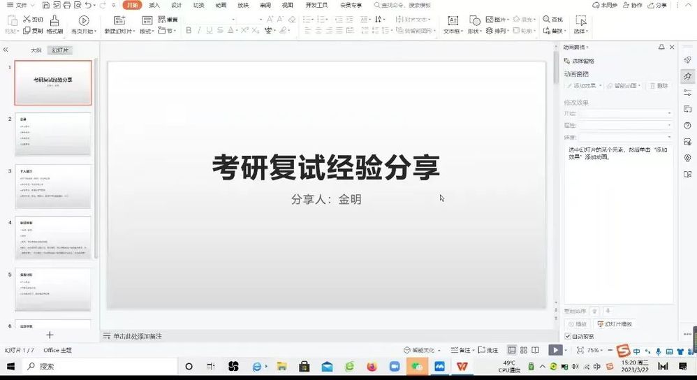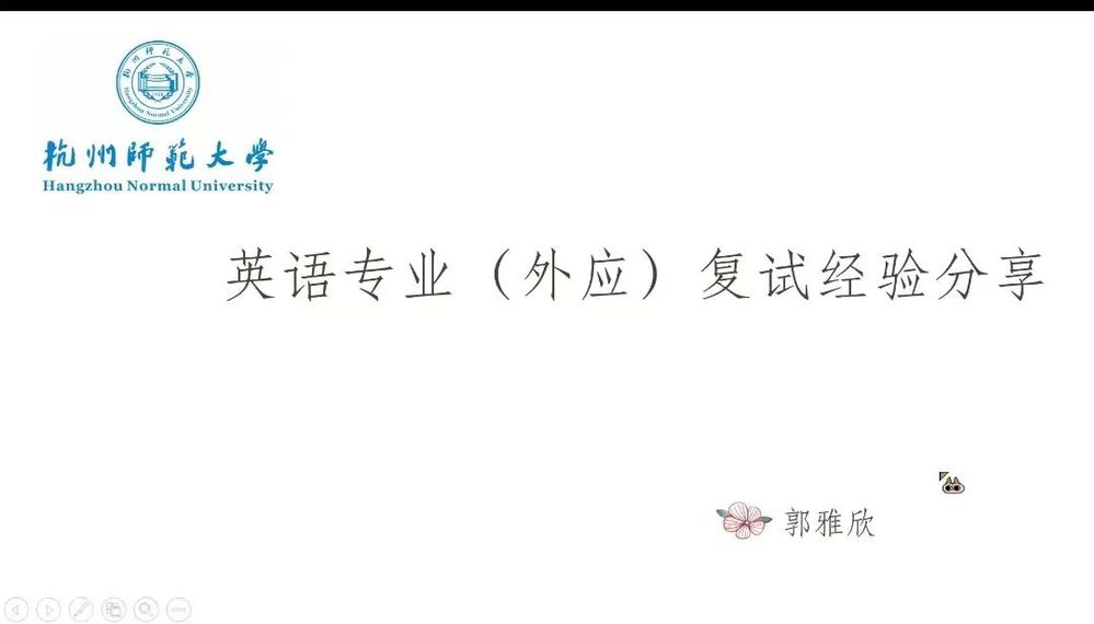 活动伊始,金明从个人简介、复试类型、准备材料、注意事项四个方面分享了自己的经验。她的分享涉及到了笔试和面试两个方面:准备笔试时,要着重复习自己的弱项,巩固自己的强项;准备面试时,则要多去了解自己报考专业相关的一些拓展知识,锻炼自己的反应能力。学姐还强调了复试时自信、大方、从容的重要性。