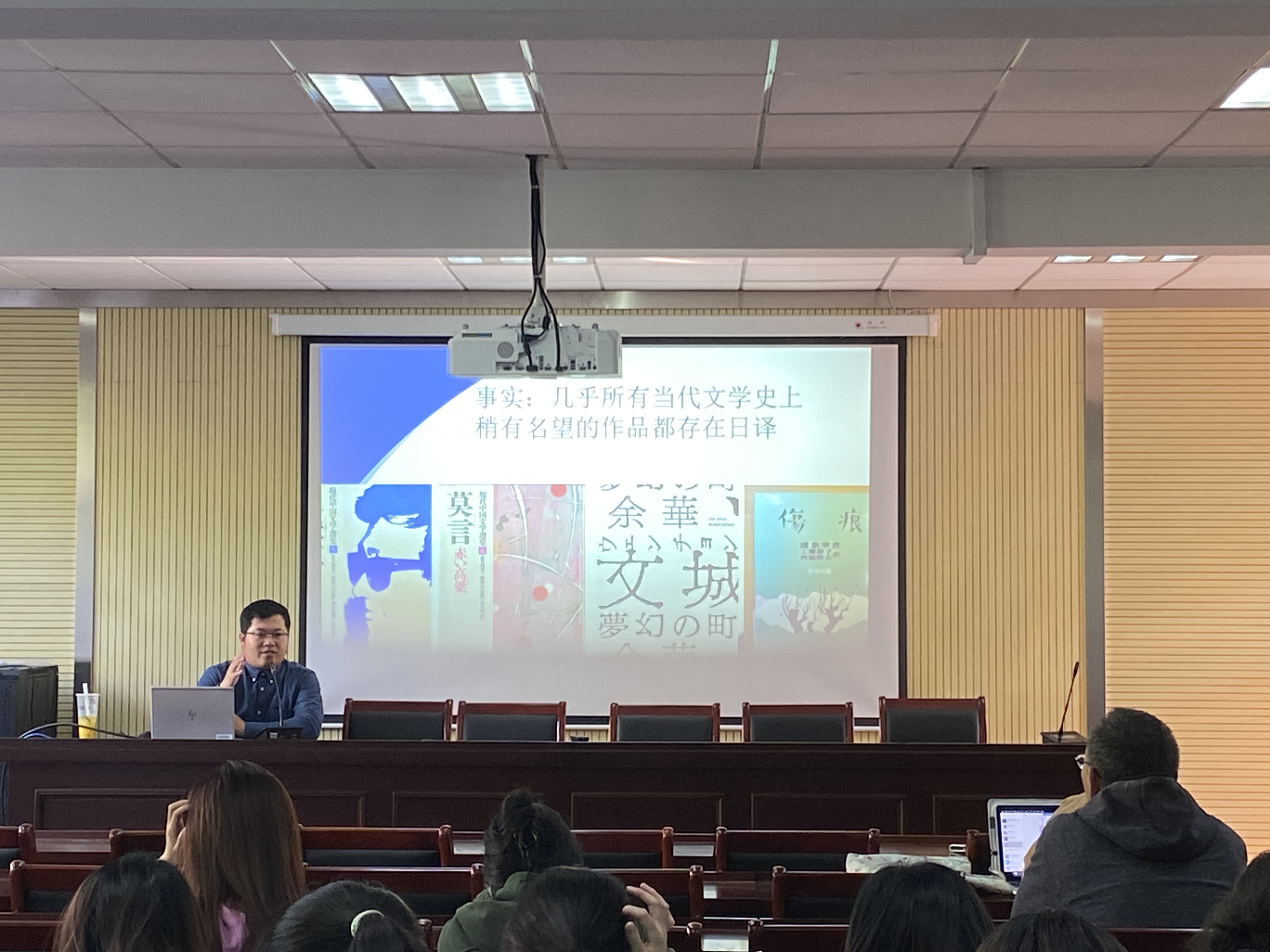 4月26日下午,孙若圣博士(后)在4-217为我院师生作了题为《中国当代文学在日本的译介与日本学者的思想水脉》的讲座。