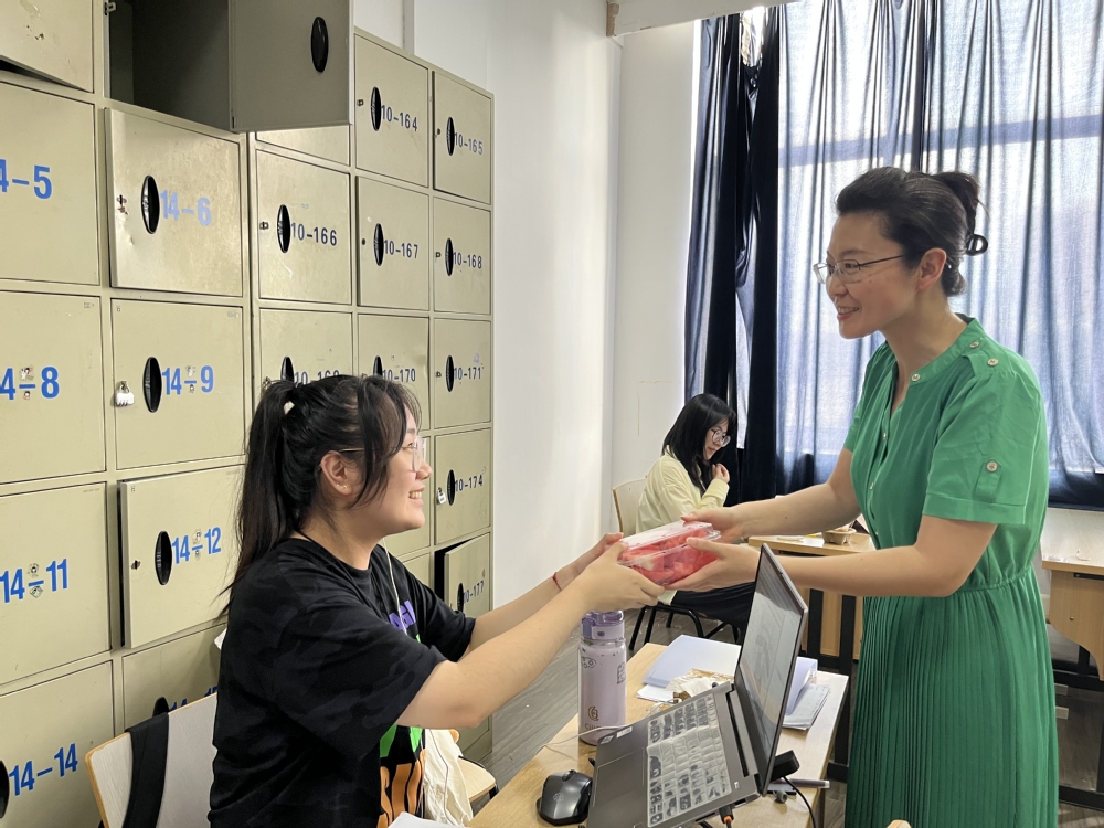 正在认真备考的同学们纷纷起身,双手接下老师们递过来的慰问品,与老师们交流自己复习的情况。