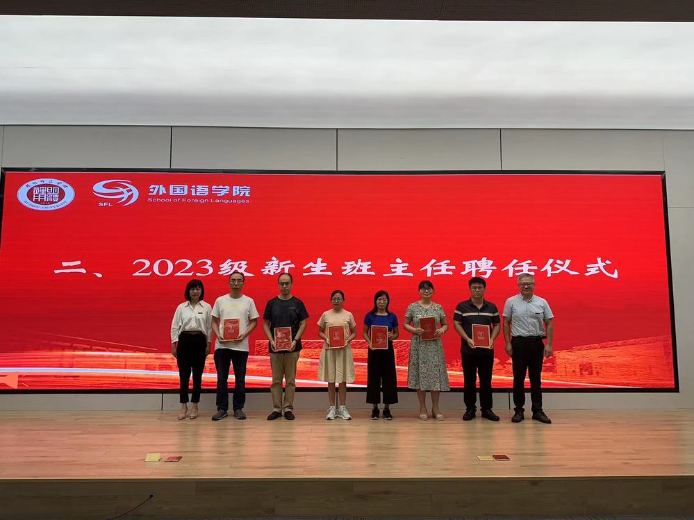 新生见面会第一项议程是2023级新生班主任聘任仪式。经过自愿申报、学院考察等综合考虑,外国语学院聘任宁强、陈振华、王学文、张晓明、张鑫、王晓瑞、孙亮7位老师为2023级新生班主任。外国语学院院长初良龙、院党委书记叶莉为7位班主任颁发聘书。