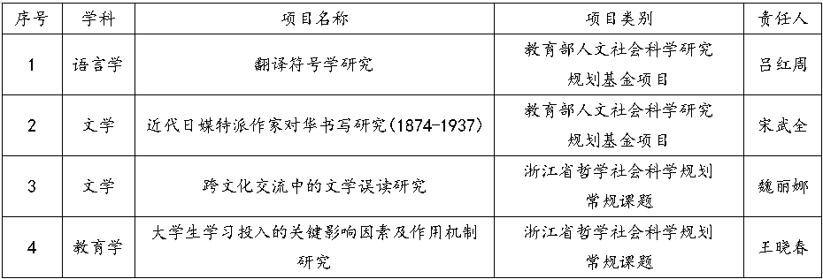 除教育部课题之外,我院还获批2024年度浙江省社科基金课题2项。分别是魏丽娜主持的《跨文化交流中的文学误读研究》、王晓春主持的《大学生学习投入的关键影响因素及作用机制研究》2项课题。