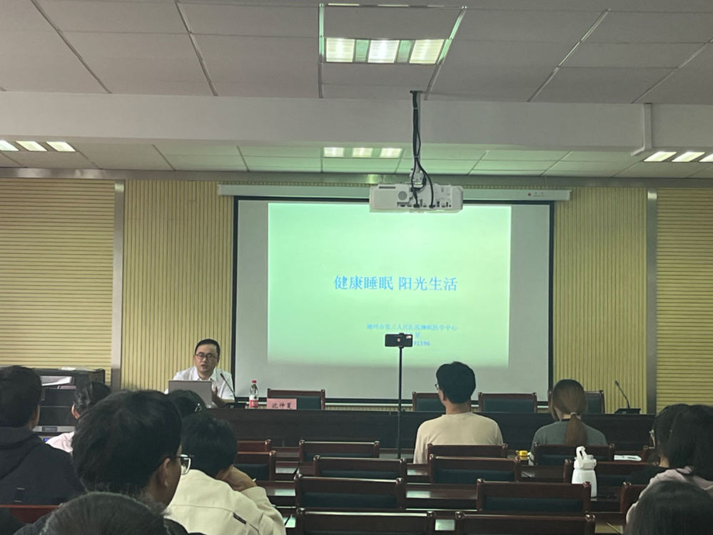 沈医生以“科学睡眠,乐享生活”为主题,结合工作生活压力,就如何管理情绪、调节睡眠作专题讲座。他详细介绍了睡眠对个体健康和生活质量的重要意义,分析了失眠的因素,指出焦虑和睡眠的内在联系,并对调节睡眠给出科学建议。