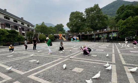 下山后大家在庾村逗留,在广场鸽和民国风情的建筑旁拍照留念。学院党政办同志陪同退休教工一起欣赏美景,欢聚畅谈,祝愿他们身体健康,退休生活充实快乐,继续关心和支持学校学院的发展建设。