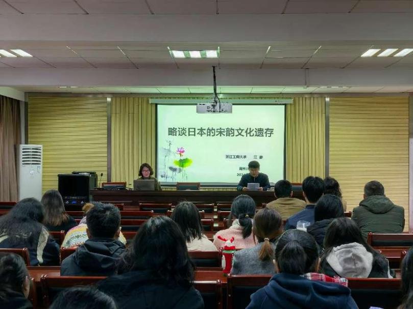 随后,江静为师生作了题为“略谈日本的宋韵文化遗存”的学术讲座。她首先引用浙江省委文化工作会议(2021)内容,介绍了何为“宋韵文化”,为何研究“宋韵文化”。她认为,对日本宋韵文化遗存的研究是“宋韵文化传世工程”的一部分,是让千年宋韵在新时代“流动”起来、“传承”下去的理论研究与具体实践。