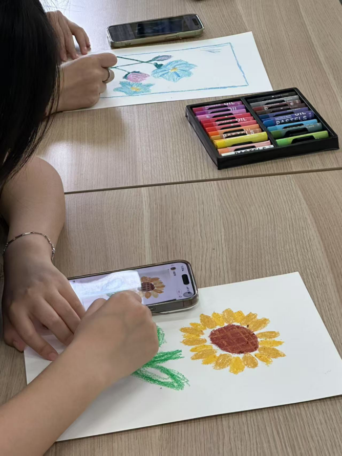 活动现场,参与者们手持油画棒,专注而投入。那一盒盒色彩斑斓的油画棒,就像一把把开启心灵世界的钥匙。大家时而对着手机上的参考图案思索,时而在画纸上轻轻涂抹。每一笔色彩的落下,都是一次内心情绪的释放。