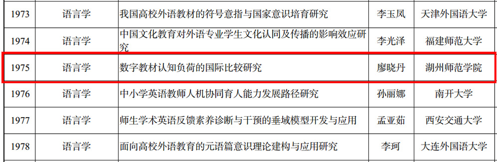 近日,2025年国家社科基金年度项目立项发布我院廖晓丹副教授作为项目负责人申报的《数字教材认知负荷的国际比较研究》成功获批立项。这也是我院继获批国家社科基金中华学术外译项目后再次突破国家社科基金一般项目,是学院近年来不断深化人才引育和有组织科研的重要成果。