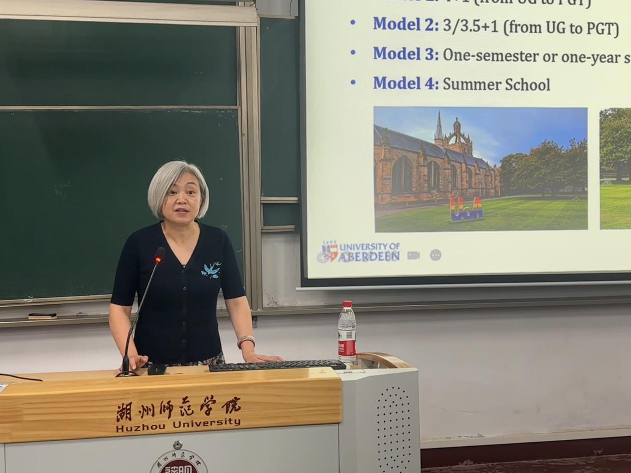 2025年11月3日晚,我院特邀我校合作院校英国阿伯丁大学语言、文学、音乐与视觉文化学院国际合作事务主任朱珠老师,为我院学生带来一场内容丰富、信息详实的阿伯丁大学硕士研究生留学项目专题宣讲会。宣讲会由副院长宁强主持,2023级英语(师范)专业全体同学及2025级英语(师范)专业专升本全体同学参加讲座。