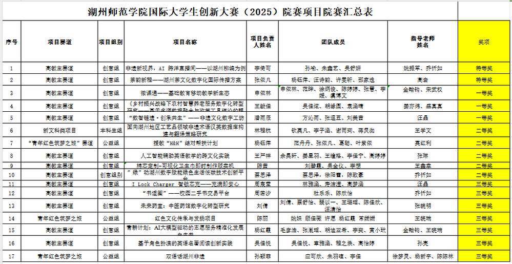 经学工办校对整理、学院组织专家进行匿名评审,共有2个项目获得院赛特等奖,3个项目获得院赛一等奖,5个项目获得院赛二等奖,7个项目获得院赛三等奖。具体项目信息公示如下: