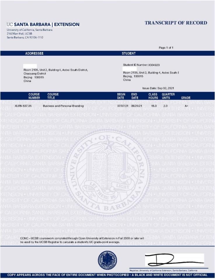 【项目收获】项目结束后将获得加州大学圣芭芭拉分校大学颁发的官方成绩单及结业证书。