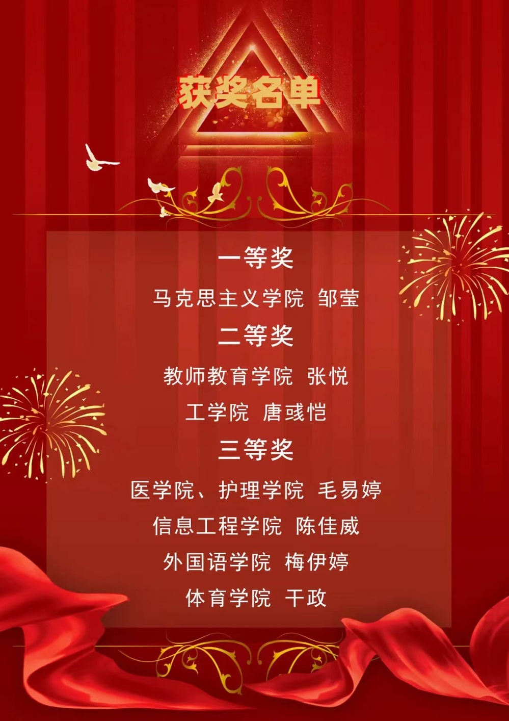 最终,马克思主义学院的邹莹同学荣获一等奖,教师教育学院的张悦和工学院的唐彧恺同学荣获二等奖,医学院、护理学院的毛易婷、信息工程学院的陈佳威、外国语学院的梅伊婷和体育学院的干政同学荣获三等奖。