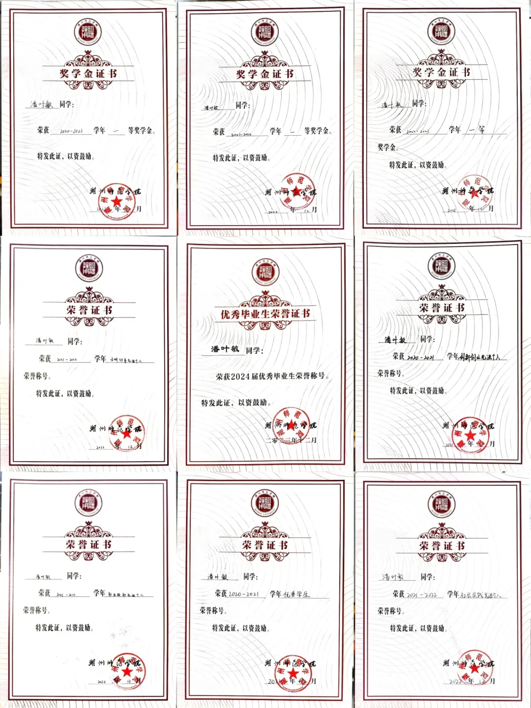 在专业课学习上,潘叶敏在专业课老师的指导下,强化自主学习,做好归纳总结,从容不迫应对各类考试。他成绩优异,名列前茅,四年GPA位列专业第三,连续3年获评校一等奖学金。在学生工作中,潘叶敏也曾担任学院自律部部长、数理协会副社长,参与各类社会实践活动十余次。获得校优秀毕业生、校优秀学生、校优秀学生干部等荣誉16项。