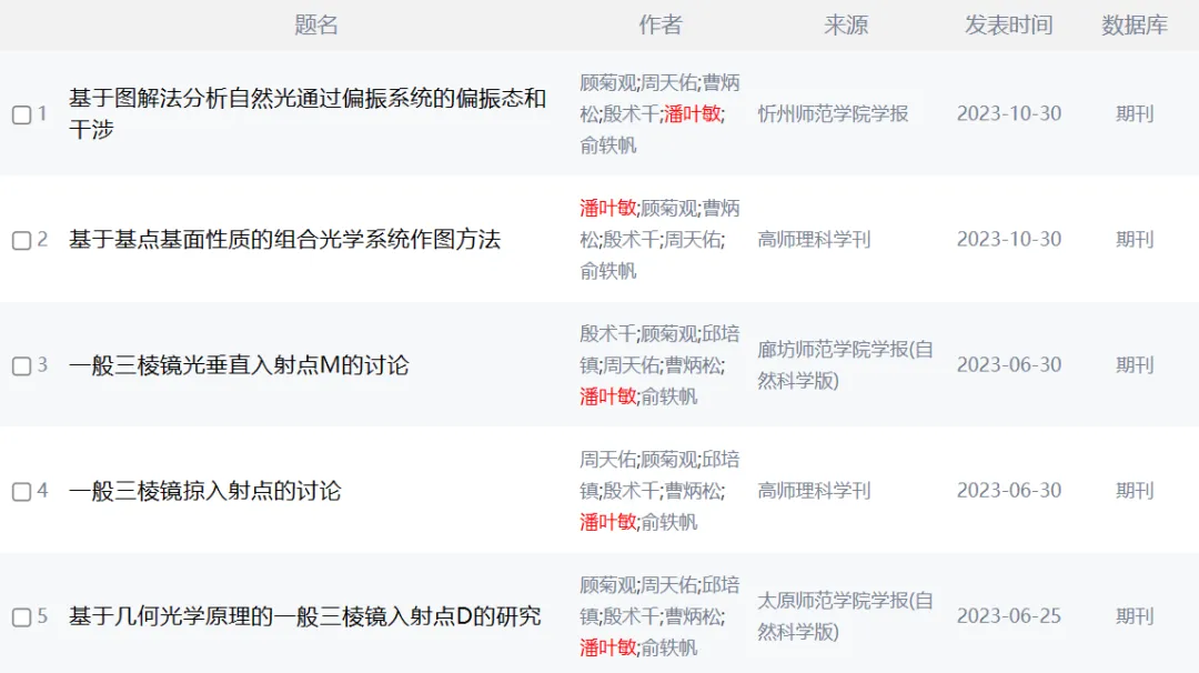 大二学年快结束时,潘叶敏确定了自己的考研目标,主动联系光学方向的导师,开展相关的科研工作。在顾菊观、曹炳松等老师的指导下,他参与发表了5篇论文,其中一篇以第一作者发表,并且主持了一项校创课题(已顺利结题)。科研的历练不仅让他在探索未知的过程中收获了“进一步有进一步的欢喜”,也让他能够在自省中保持理性,坚定进一步深造的信念。