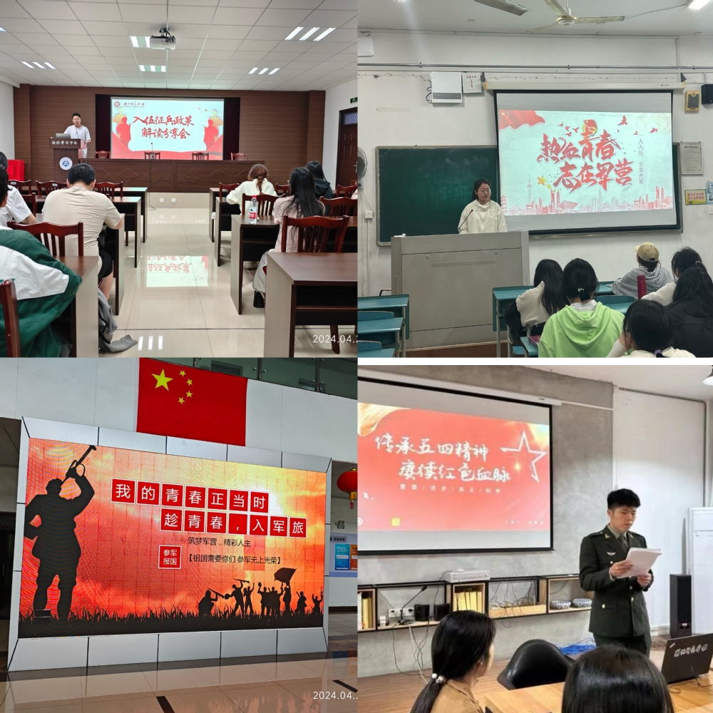 今年以来,校人武部同各二级学院一起开展“征兵宣传月”系列活动,通过“定一个宣传主题、开一次主题班会、做一次征兵宣传、做一场爱国主义教育”四个一征兵宣传活动,将征兵宣传融入学生日常,精准动员应征报名,激励更多优秀青年投身军营。截至目前,已召开征兵宣传主题班会50余场,各学院相继开展征兵宣传、爱国主义教育20余次。