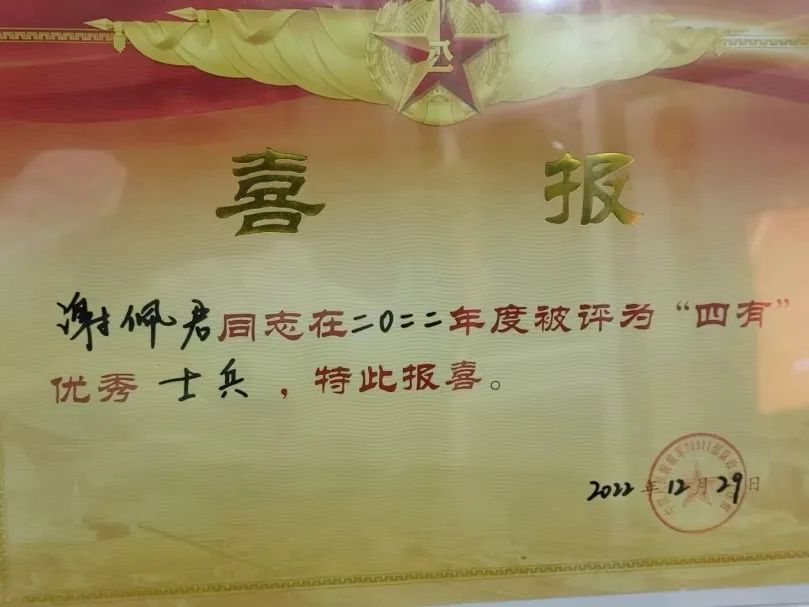 2022年,话务班缺人手,谢佩君站了出来,填补上这份空缺。她主动承担起两份责任,文书室和话务班两头跑。两个月里,她住在值班室,在工作之余还要体能训练,但她一项也没落下,都取得了优异成绩。付出就会有收获,11月,谢佩君获得了军旅生涯的第一个“四有”优秀士兵。