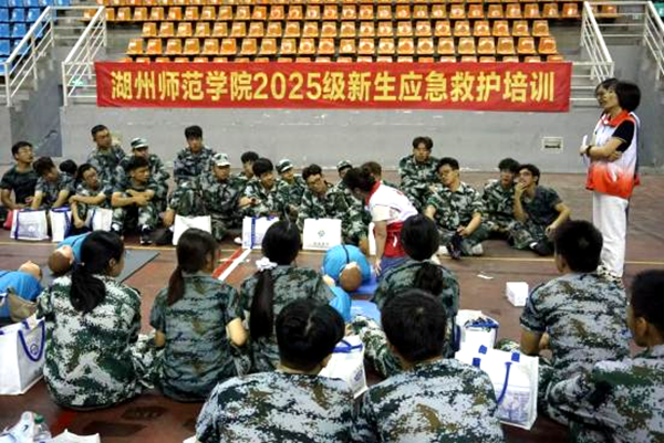 2025级新生军训期间,学校首次将全员应急救护“CPR+AED”培训全面纳入军训课程体系。作为军训期间的一项重要训练科目,并于军训汇报表演中首次设立“应急救护”特色方阵进行展示,充分体现了学校在国防教育与生命安全教育工作中的创新融合。