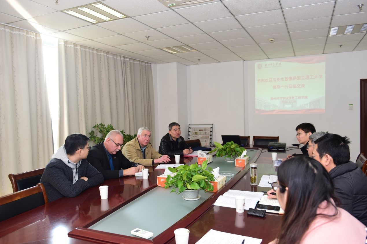 12月29日下午,乌克兰敖德萨国立理工大学得雷维扬琴科·亚历山大·乔治耶维奇教授和西多连科·伊戈尔·伊万诺维奇教授一行来我院考察交流,会议由信息工程学院副院长(主持工作)胡文军主持,副院长潘建新、副院长黄旭以及相关老师参加此次考察交流座谈会。